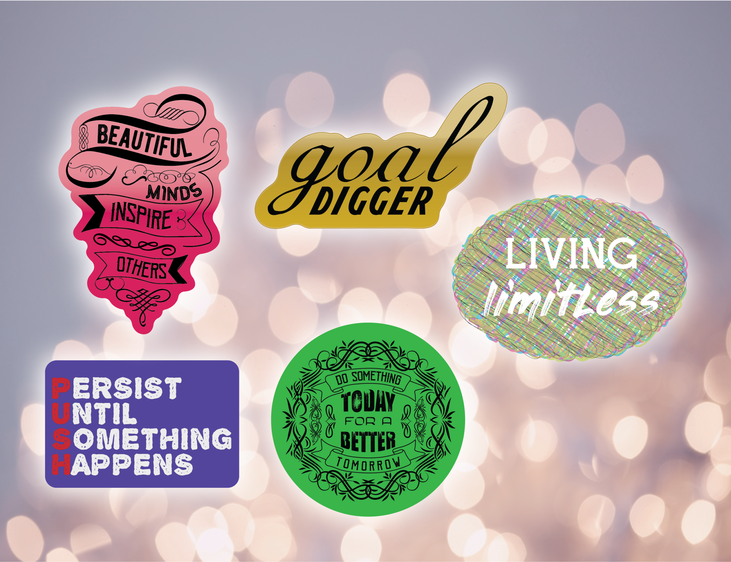 We use our premium vinyl stickers that are printed on select materials and are somewhat standard shape or size to keep it easy. Durability is our guarantee, and we select quality North American made print products to ensure your custom vinyl stickers stick out and stand up to almost anything that can be thrown at them.
